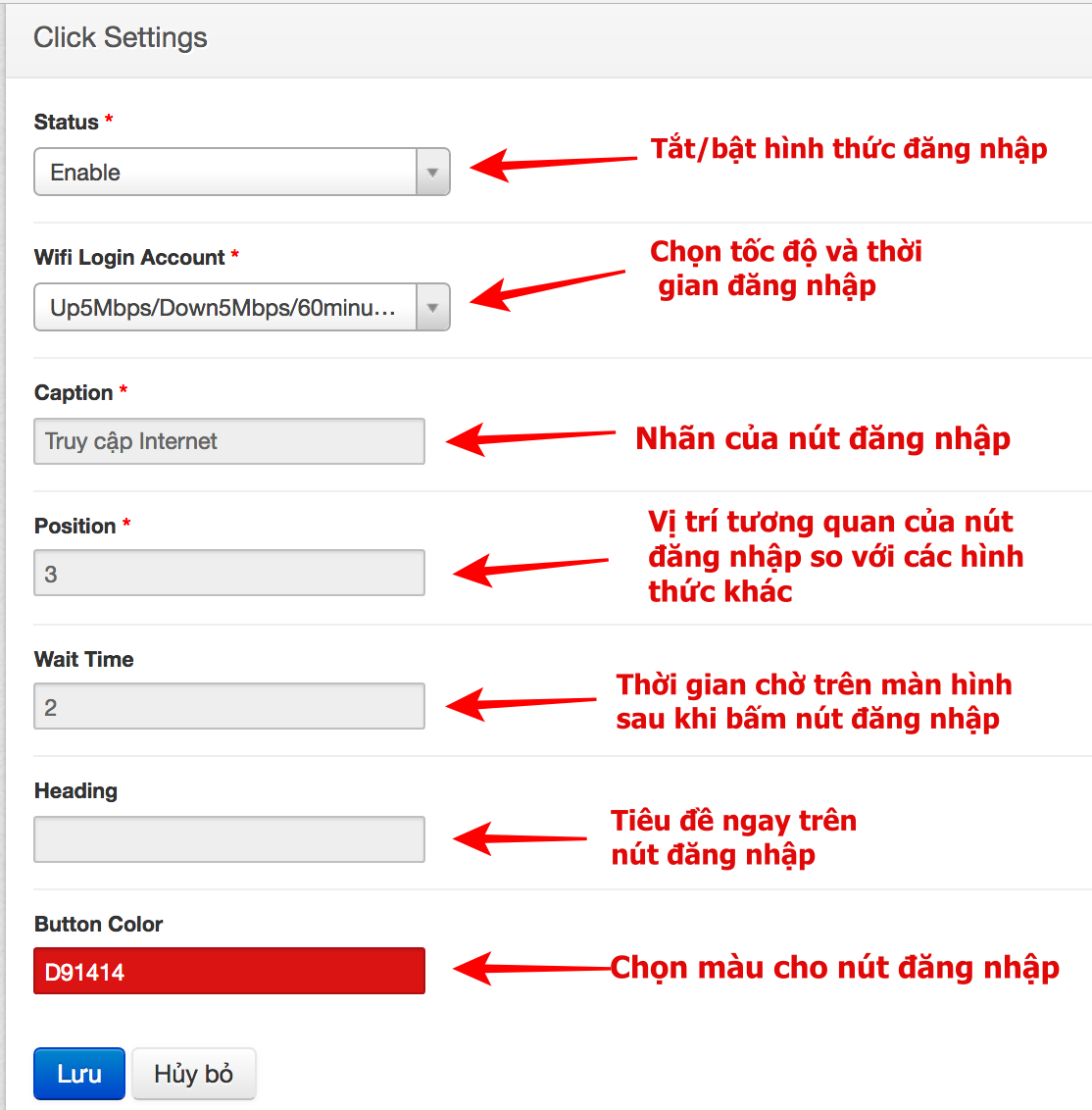 Đây là hình thức đăng nhập đơn giản nhất, người dùng chỉ cần bấm nút, ví dụ: Click để đăng nhập WIFi, là đã có thể được truy cập Internet. Dễ thực hiện nên khách hàng cũng dễ chấp nhận.